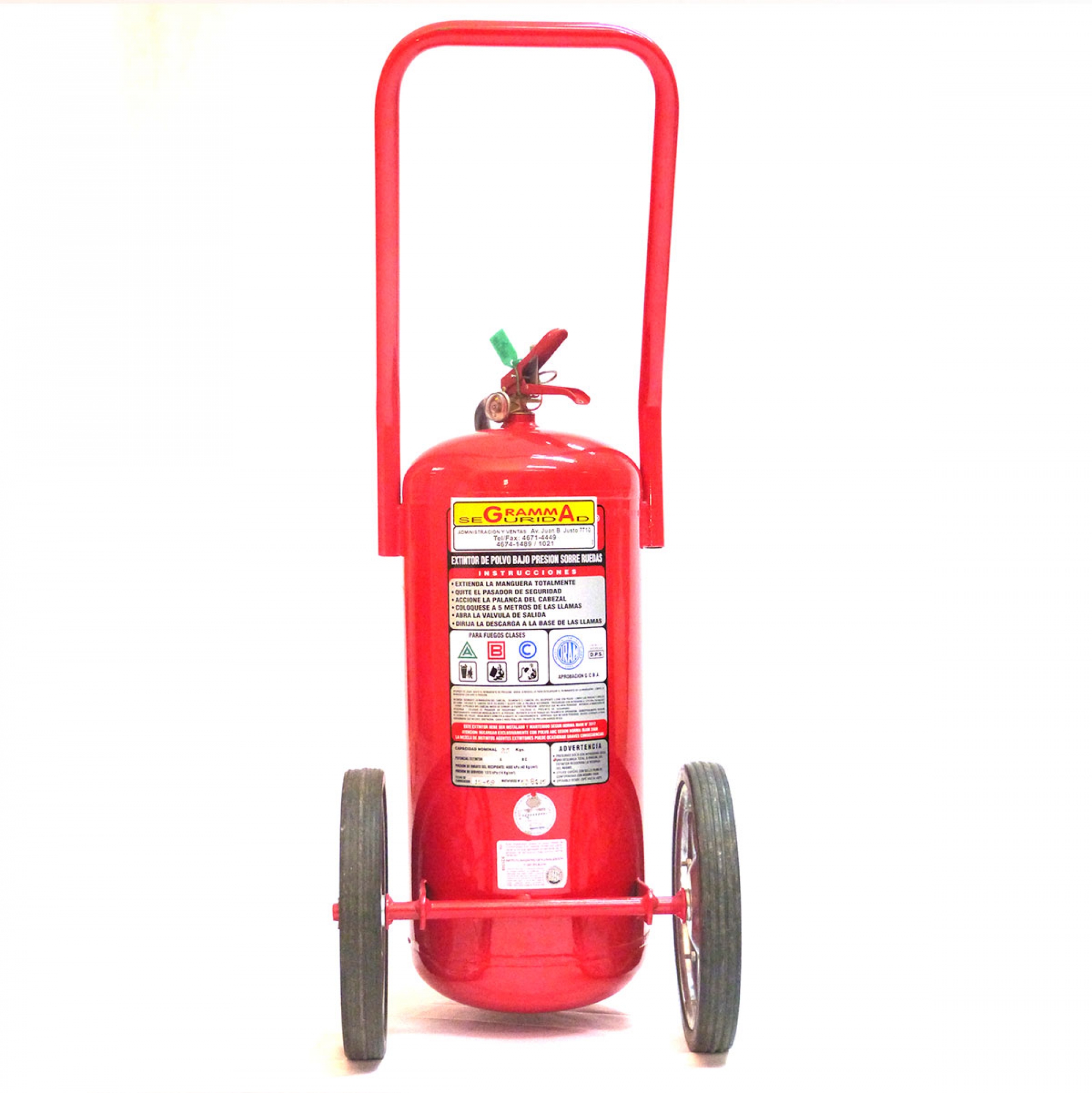 Carro extintor tipo AB para combustibles sólidos y líquidos. Capacidad 25 litros. Manguera de 10mts.